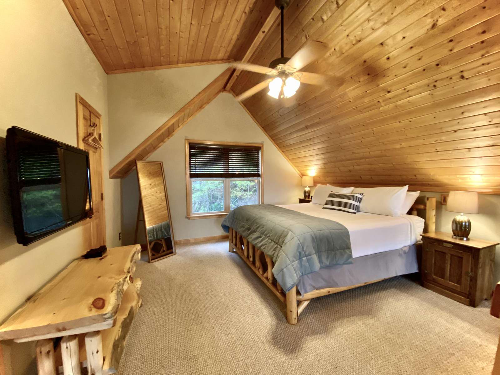 Come back inside to explore the rest of the cabin including the main level bedroom which offers a Flatscreen TV, and a very comfortable and luxurious queen size bed (High quality Firm Mattress with a Luxury Top layer added for a Soft touch).